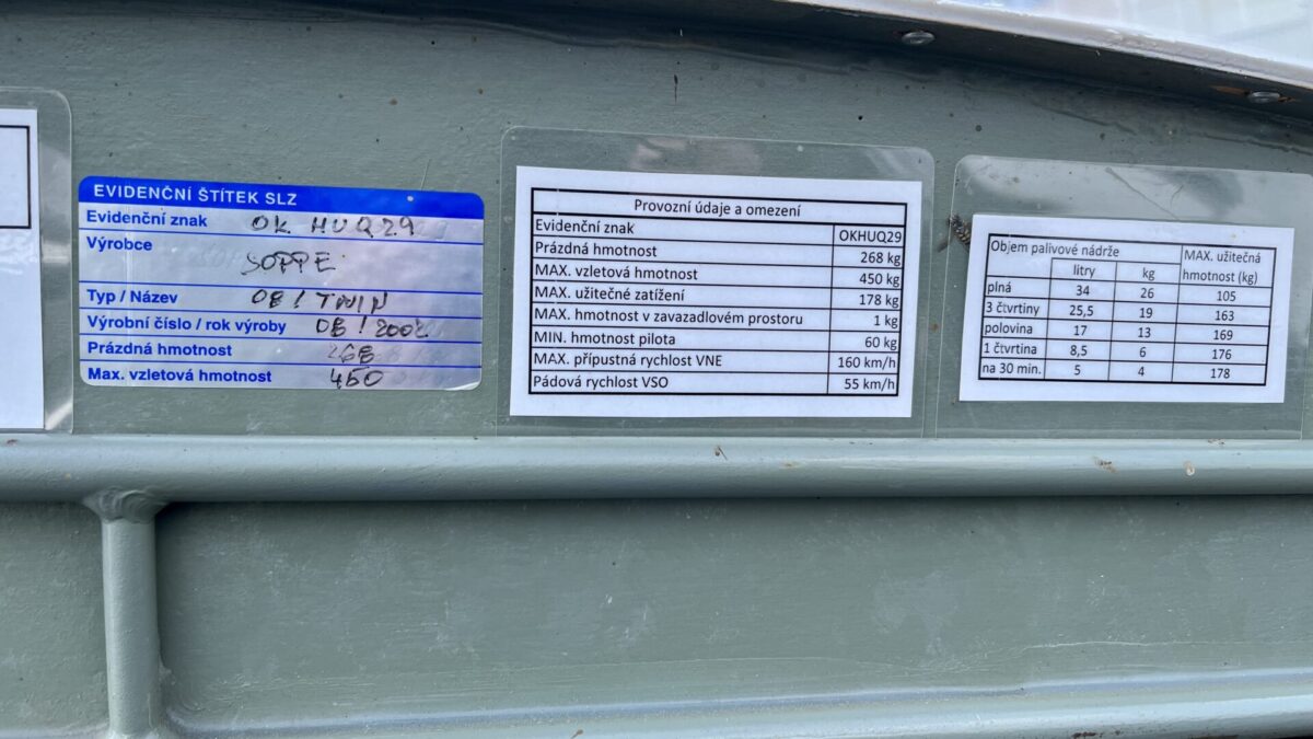 Z důvodu pořízení modernějšího klubového letadla, nabízí Deltaklub Stichovice dvoumístný UL letoun SOPPE Twin z roku výroby 2002. Motor Subaru E81 se zubovým reduktorem. Původní motor Subaru byl před pár lety vyměněn za novější kus a byla zároveň provedena celková modernizace palivového a výfukového systému. Současný motor nalétal pouze 140 hodin! Drak má 950 hodin, stav se mění, letadlo stále létá! Základní letové a motorové přístroje. Nedávno provedená konverze hlavního podvozku na nohu STOL Zenair, včetně nových kol a všech pneumatik. Brzdy lankové, bubnové, ovládané nožními pedály z levého sedadla. Intercom, rádio Icom 8.33. Velmi klidné a nezáludné letadlo bez vztlakových klapek, vhodné pro turistiku i pro výcvik! Cestovní rychlost 80 – 130 km/h. VNE 160km/hod. Spotřeba 8 až 10 litrů N95 za hodinu. Nádrž za sedačkami – 30 litrů. Relativně velký zavazadlový prostor a prostorná kabina i pro piloty většího vzrůstu! Čtyřbodové bezpečnostní pásy. Řízený ostruhový podvozek. Platné pojištění do konce roku 2026. Platná technická prohlídka. Bez záchranného systému. Křídla nelze sklápět. K vidění LKSB Stichovice u Prostějova. V případě zájmu možnost přeletění Twina novému majiteli až do nového působiště. Cena pouze 150.000 Kč! Kontakt Deltaklub Stichovice – Martin Rolný 73153331jedna nebo Cyril 60877792pět.